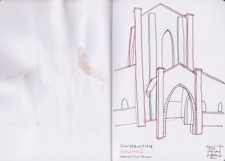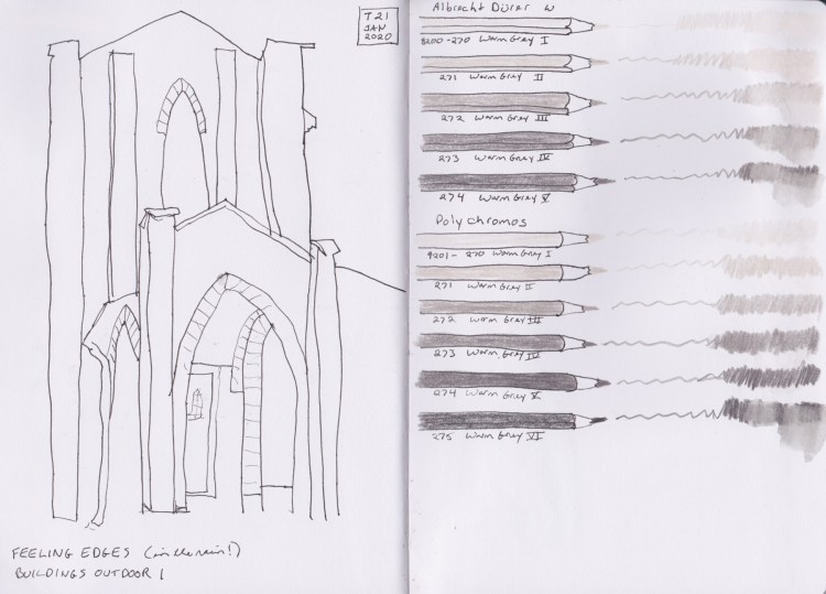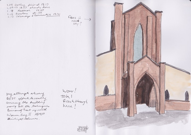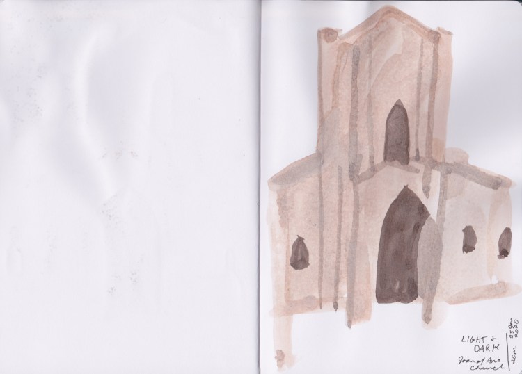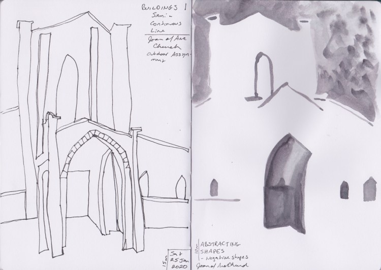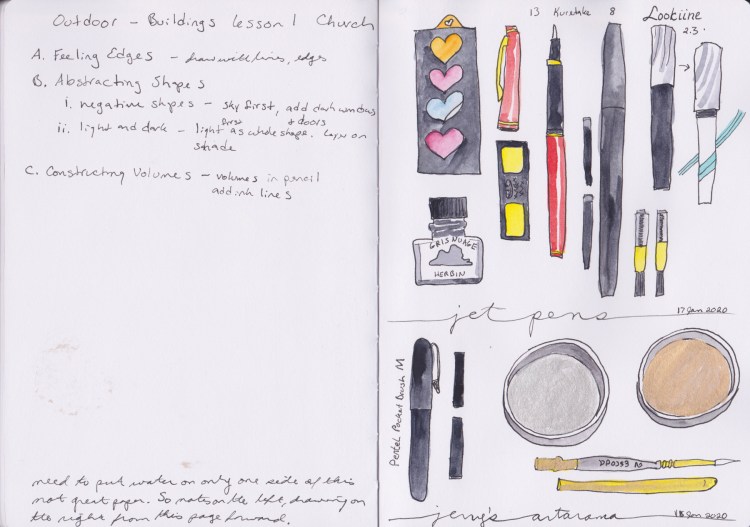 In January 2020 I started the Buildings Course by Liz Steel. I love her work, and her classes! She is an inspiration to me! I decided to use this sketchbook, though I had several going at the time, in an effort to finish it off.