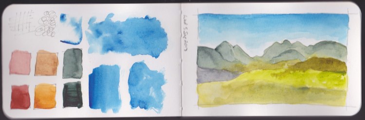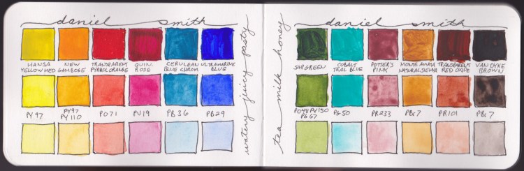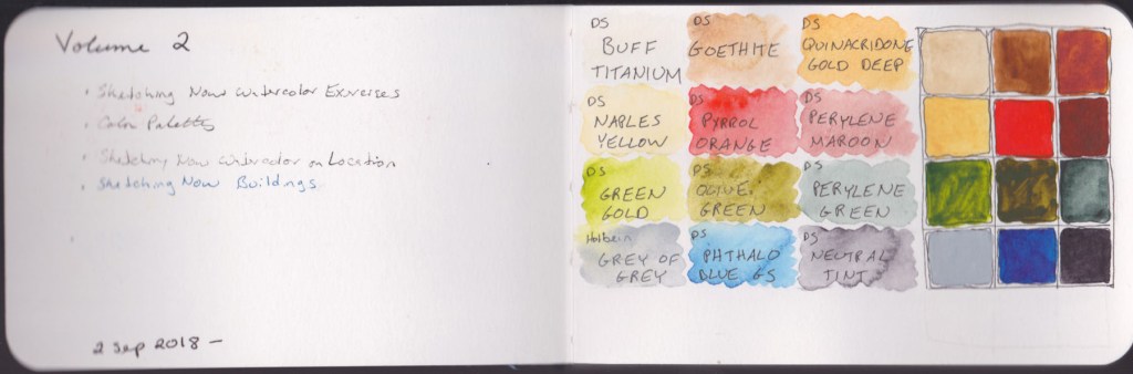 I wanted to do the lessons with two different palettes. I had purchased Marc Taro Holmes Direct Watercolor Palette, but I had never used it. I figured using two different palettes would really teach me about color. It did! So I did the same exercises twice, and in this sketchbook, volume 2, I did the Watercolor assignments using this palette.