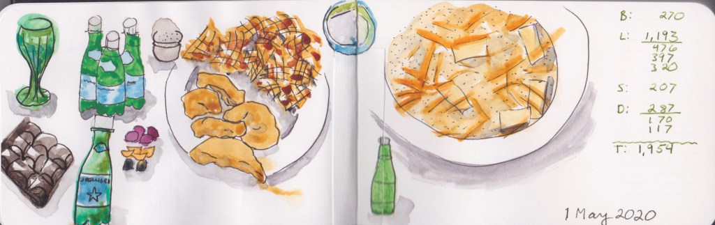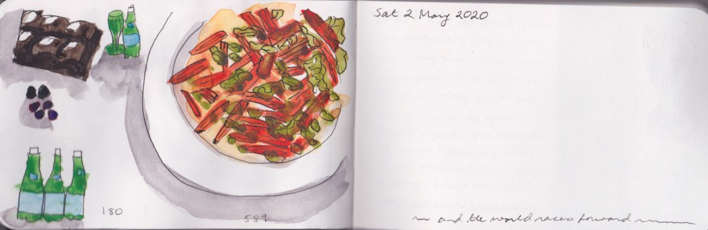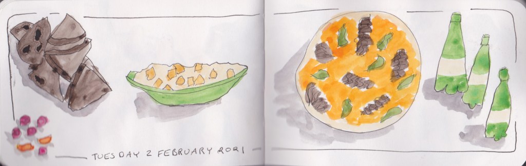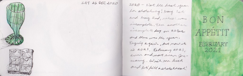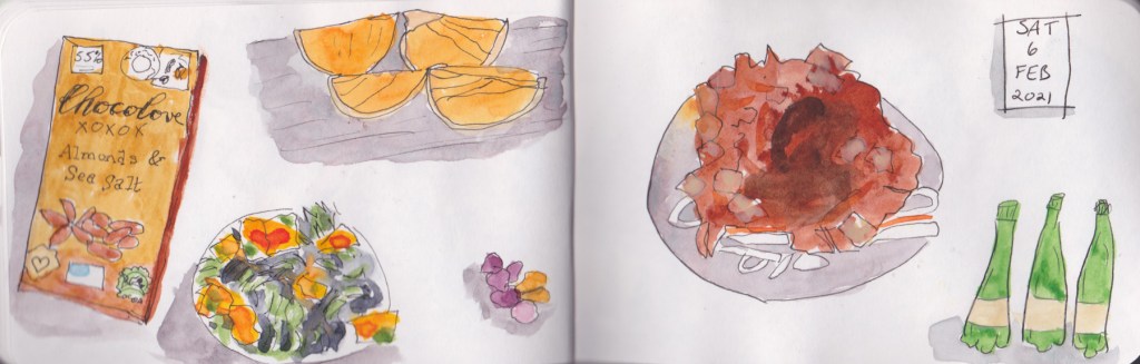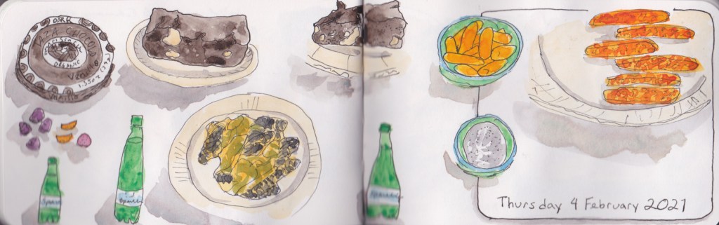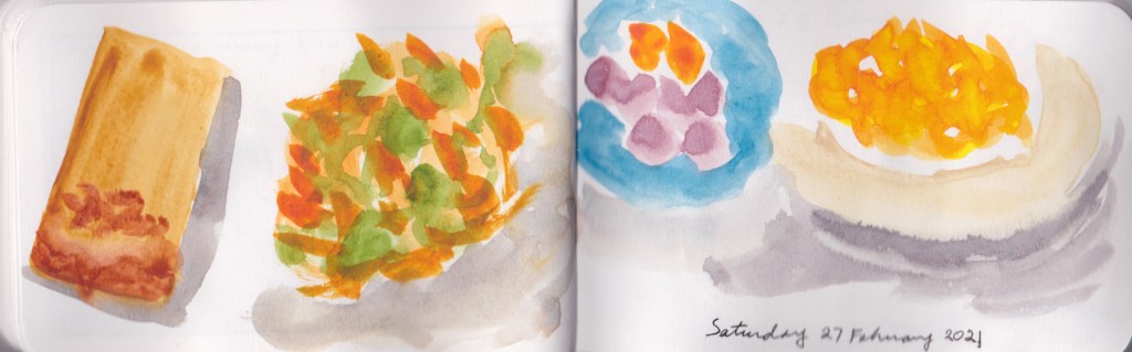I find that sketchbook design elements really do help these pages come together. The frames, the text, the date heading. I shall be working with those elements more for the next food sketchbook.