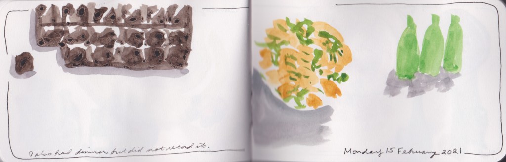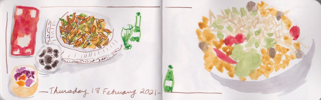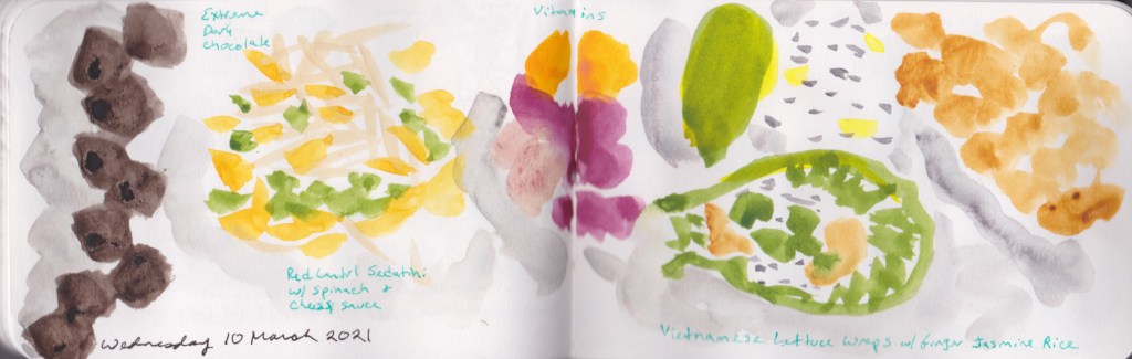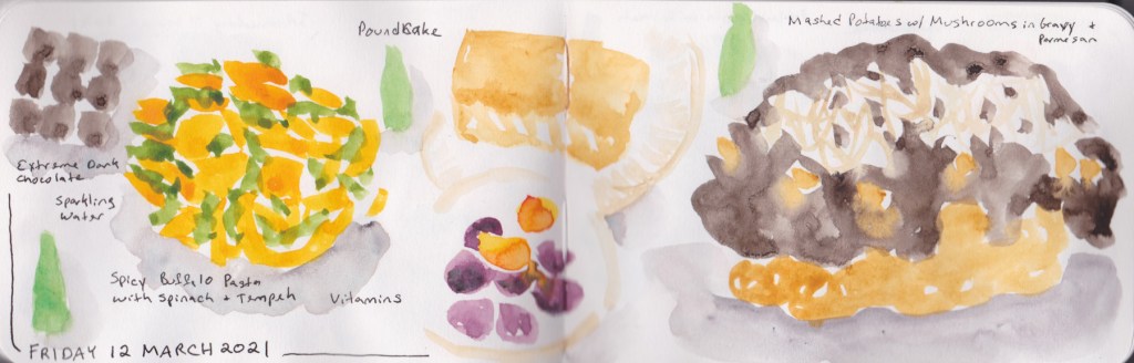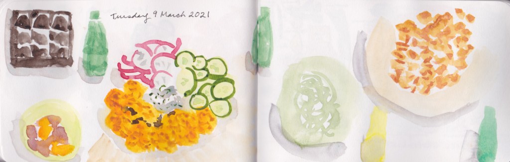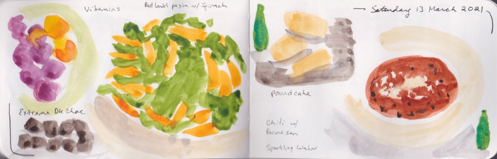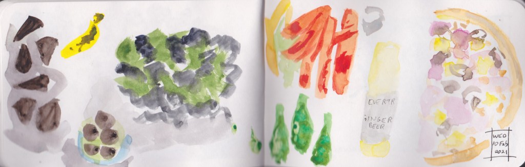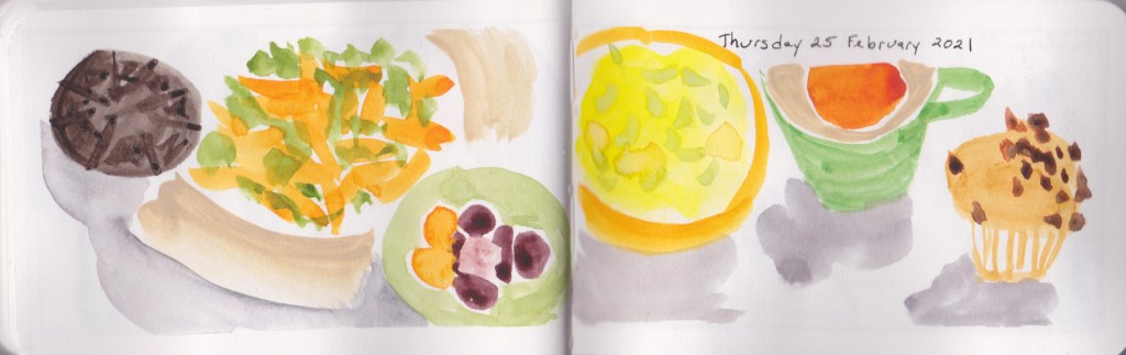 Sketching your food everyday is like sketching boot camp. It was also a great way to get back into the daily sketching habit. (I did very little sketching during 2020.) My aim was to work fast, get my color mixes as accurate as I could, and, of course, record the moment. Most of these I sketched after I ate, from photographs, since I haven’t yet mastered the self-restraint not to dive into the food when I’m hungry!