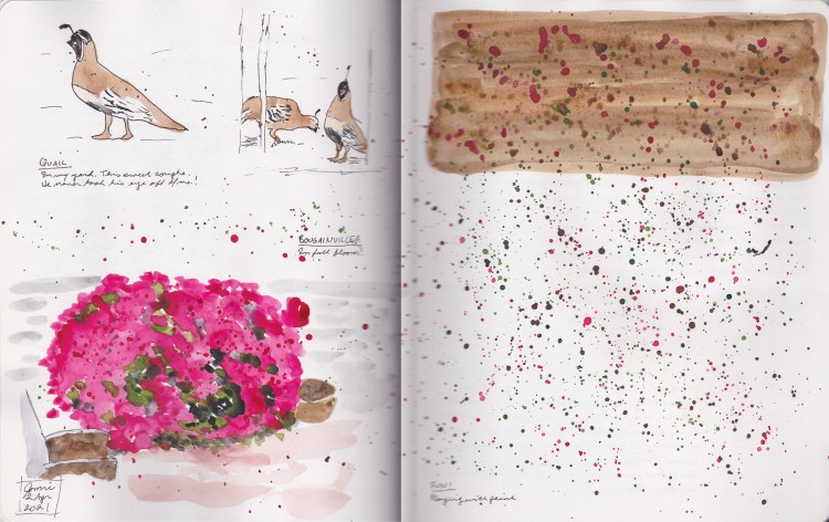 The bougainvillea in my backyard really is giving a most beautiful display this year! Stunning blooms. I love how this direct watercolor approach captured the fullness and richness of those pink blossoms. The whole thing inspired me to splash, and I went a little crazy, but Loved it! I got a visit from a pair of Gimbol quail so I snapped a photo and sketched them! This spread gives me such joy!