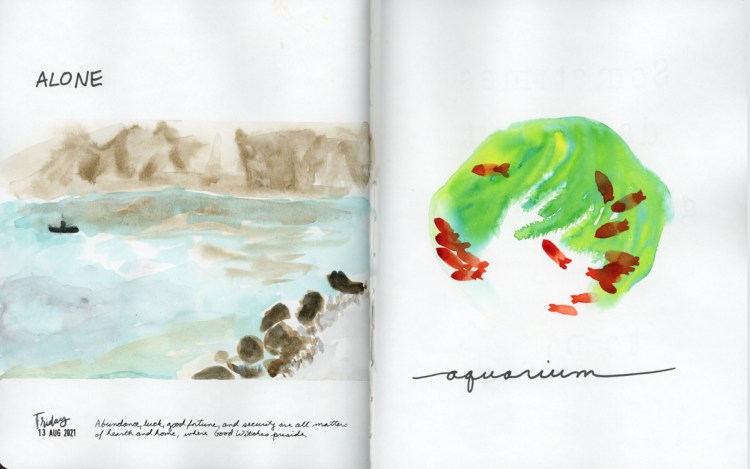 The landscape is a view from the television show Alone, and is of Chilko lake in Canada. The aquarium sketch is from a photograph. I was aiming for having lots of white space, which I certainly achieved. I’m thinking the page needed a little bit more variety, though. I’m thinking of these things, since I am taking Liz Steel’s Sketching Now Sketchbook Design course.