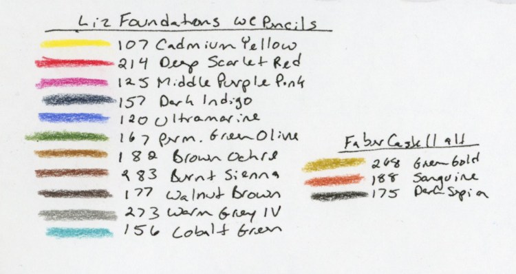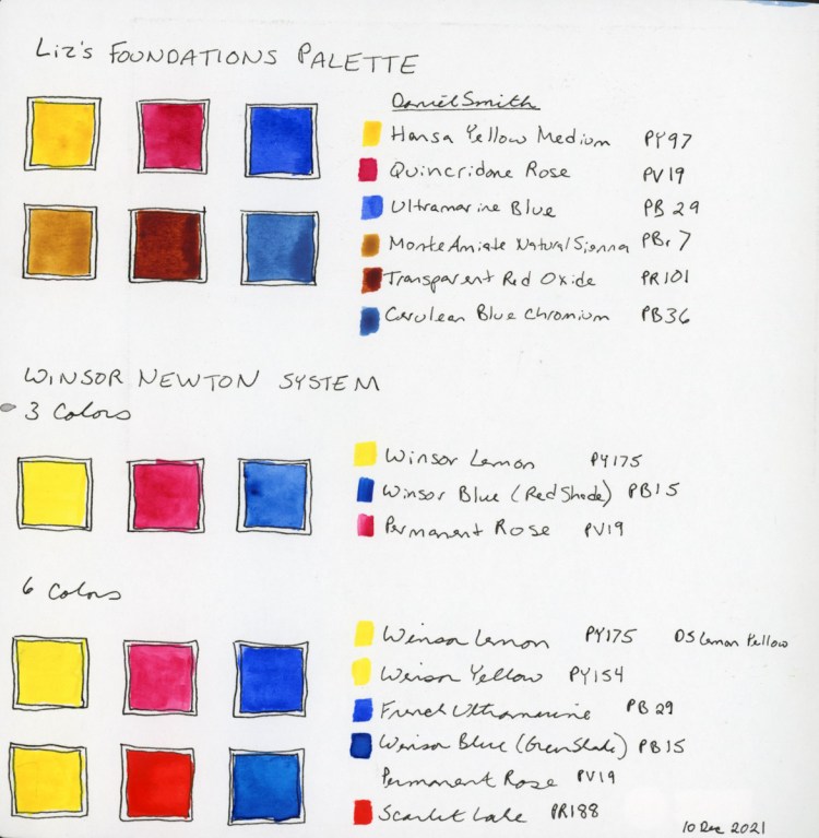 Once upon a time, when I got my first watercolors, I’d see a pamphlet that Winsor Newton put out about which of their colors they recommended for a six color palette, so I had to go research that and put it in my notes. However, I’ll be using Liz’s for class, particularly since I’m really curious how the earth colors will mix. Can I get “clear” tones? I’m excited to find out!