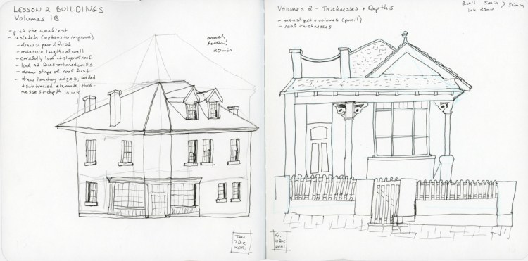 Getting better and better! My biggest success has to be in “thicknesses” and that there are a LOT more lines needed when drawing buildings! I’m getting so much more dimensionality. Even my angles and proportions, by far a big weakness of mine, are getting better! I really need to keep using pencil set up lines for that accuracy aid!