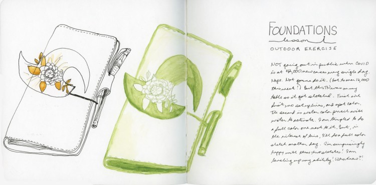 My assignment was to draw something on a table in public, using two different types of materials. One in pen only, with spot color, and the other in watercolor pencil. Well, due to the current massive surge in COVID cases in my city, I’m not doing anything in public! However, this TN was on my table and it is one of those objects I never think about sketching, because it’s always around. Perfect!