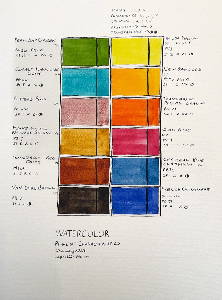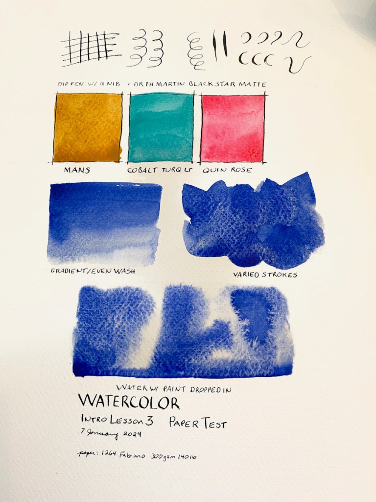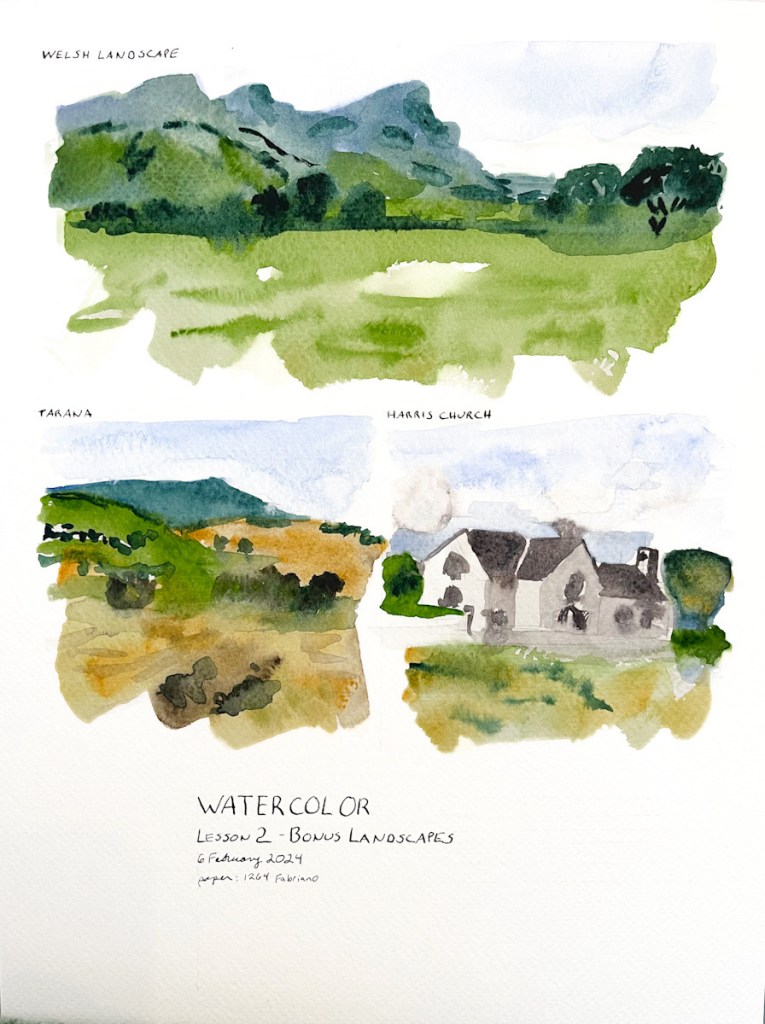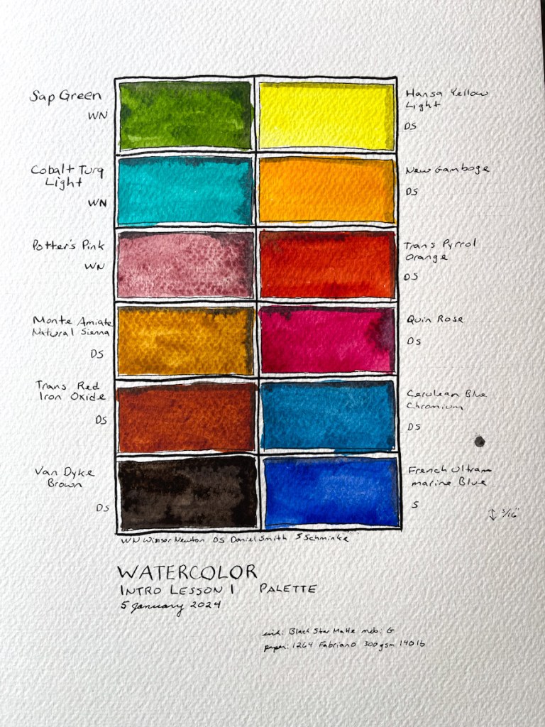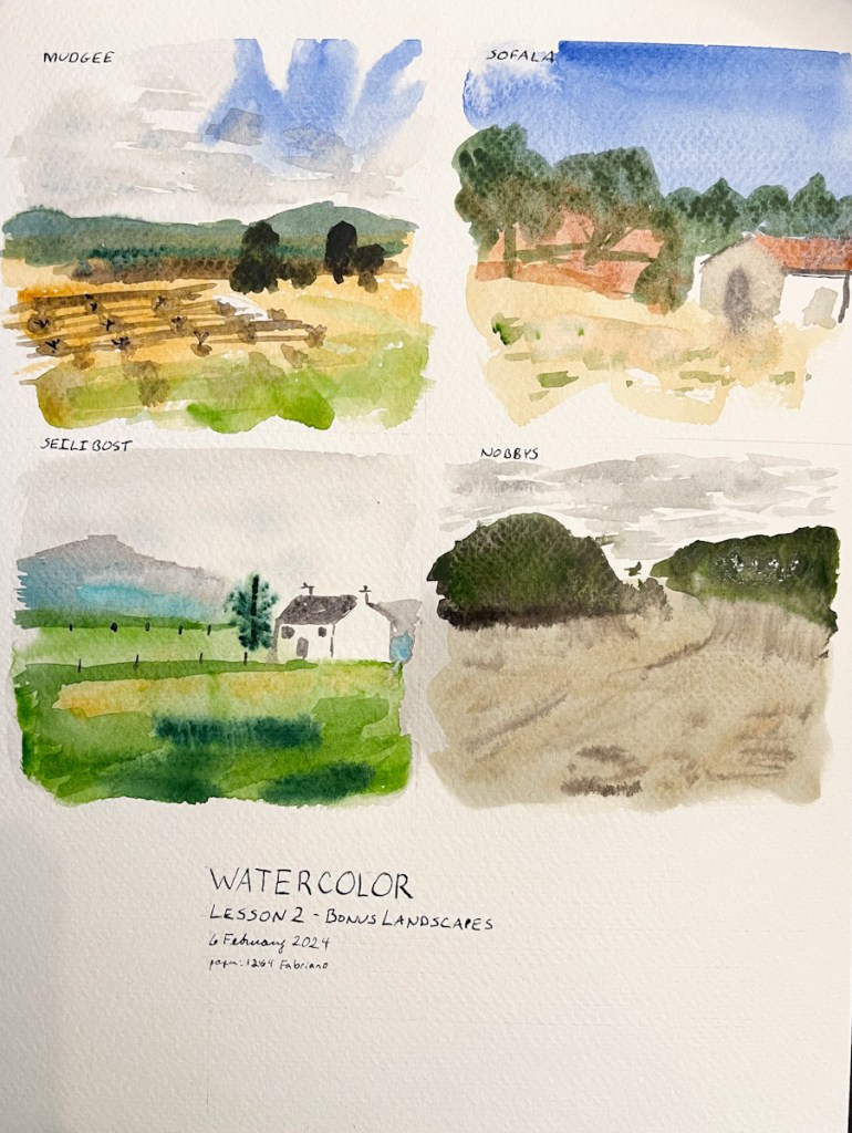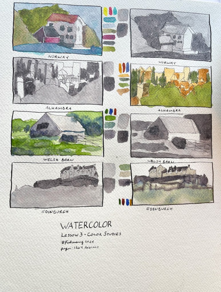 My fifth run through Sketching Now Watercolor. I had fun this year, and made a page design formula. I also did this year on loose watercolor paper, Fabriano 1264, which is a student grade watercolor paper I had in stock.