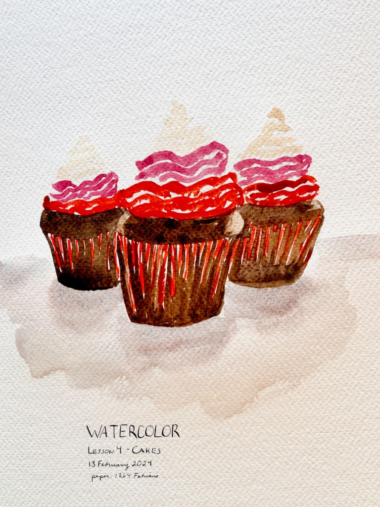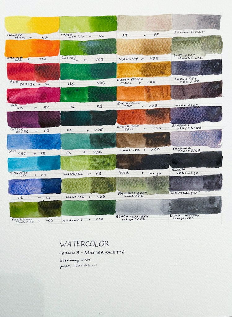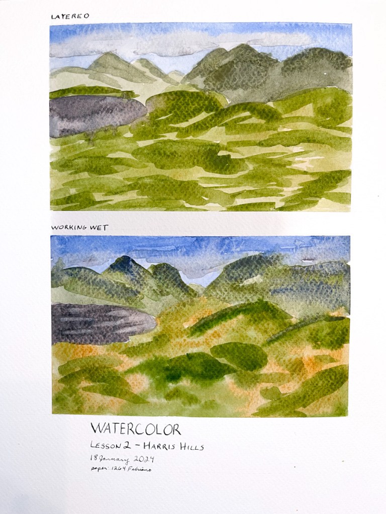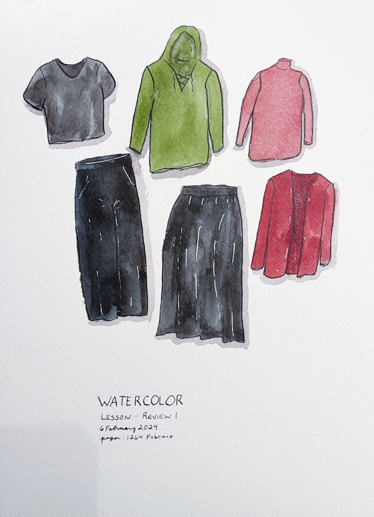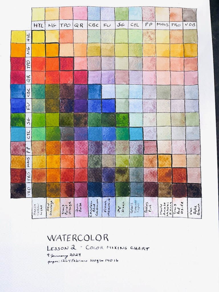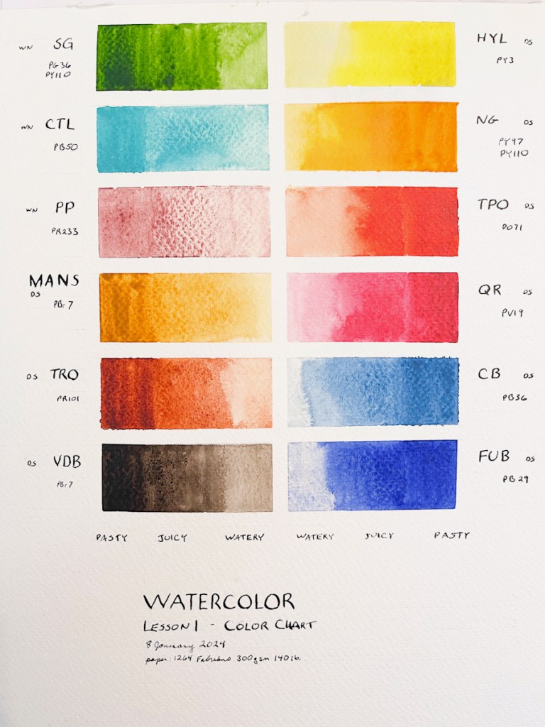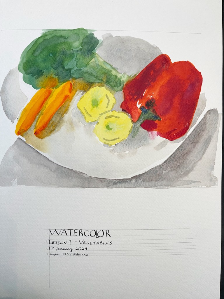 My fifth run through Sketching Now Watercolor. I had fun this year, and made a page design formula. I also did this year on loose watercolor paper, Fabriano 1264, which is a student grade watercolor paper I had in stock.