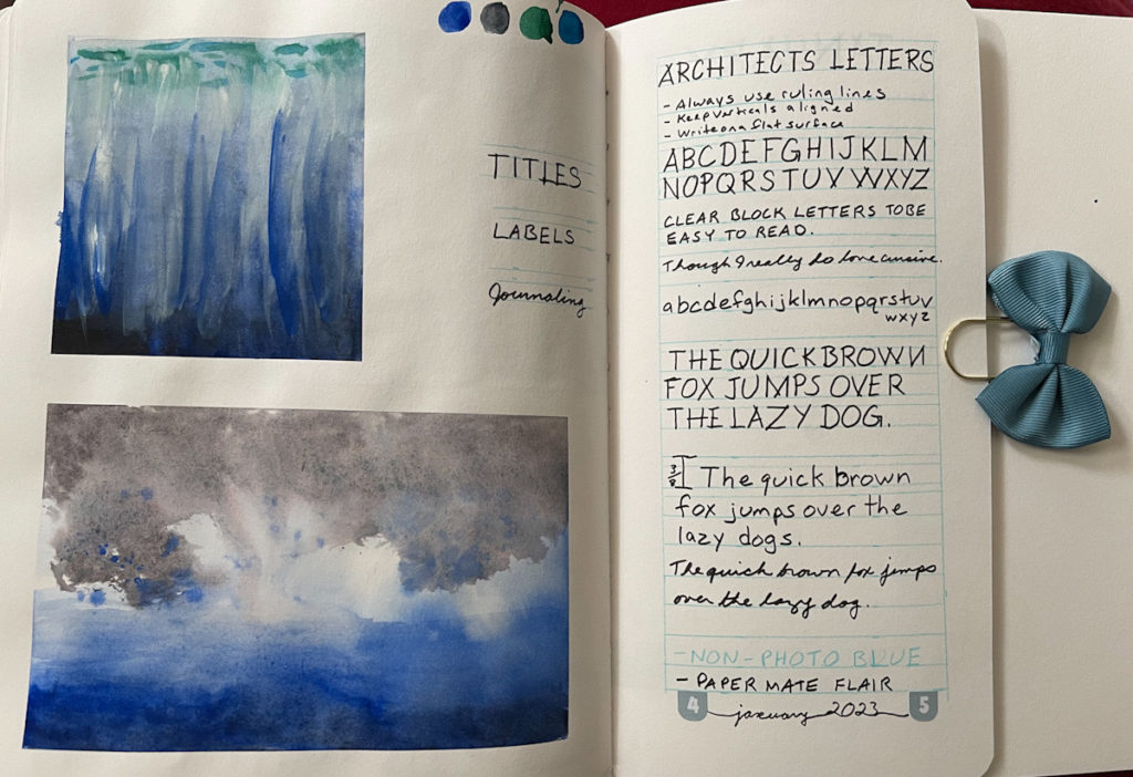 Always a fun page to do for Sketchbook Design Class. This year I’m keeping things simple and using only different widths of pen for headings. I have been opting for fast over style lately. As ever, I always use my own cursive for the majority of my text, as it is very easy and very fast for me.