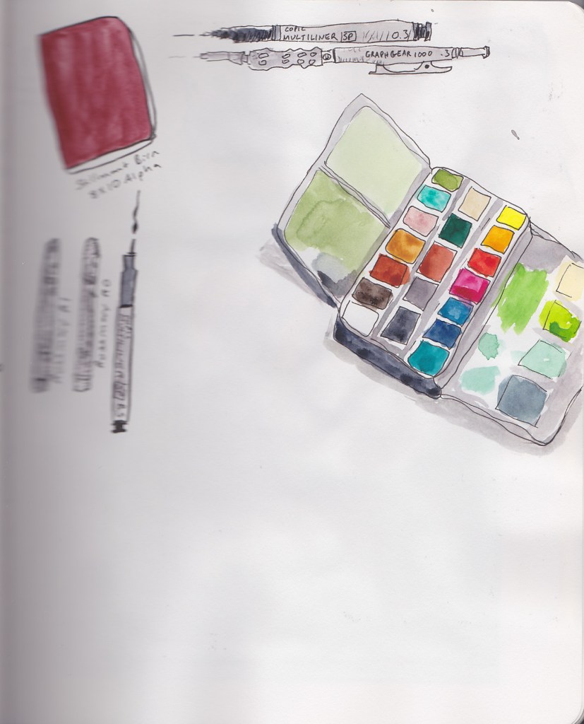 My sketchbook and materials for this class. I am currently preferring the smaller size and the alpha paper. I have two going at the moment, a 6×9-inch landscape that I started for the Travel Sketching Class, and a 7.5-inch square that is my everyday. It’s almost finished! I am also carrying around an A5 Stalogy that I was using as my food diary sketchbook since it’s pages are super thin and it does take watercolor without bleeding, so I can have a longer period of time in one book. I haven’t kept it up, so I may abandon it soon? This trio of sketchbooks I’ve been carrying around for a couple months now, so it feels very familiar. (Note to self, I’m looking forward to taking Foundations again in January, because I’m still not getting the angles on stacks of books right! Hardest thing to draw! Ever!) These two sketches are actually on two different pages of my sketchbook, but they would have looked quite good together in one spread!