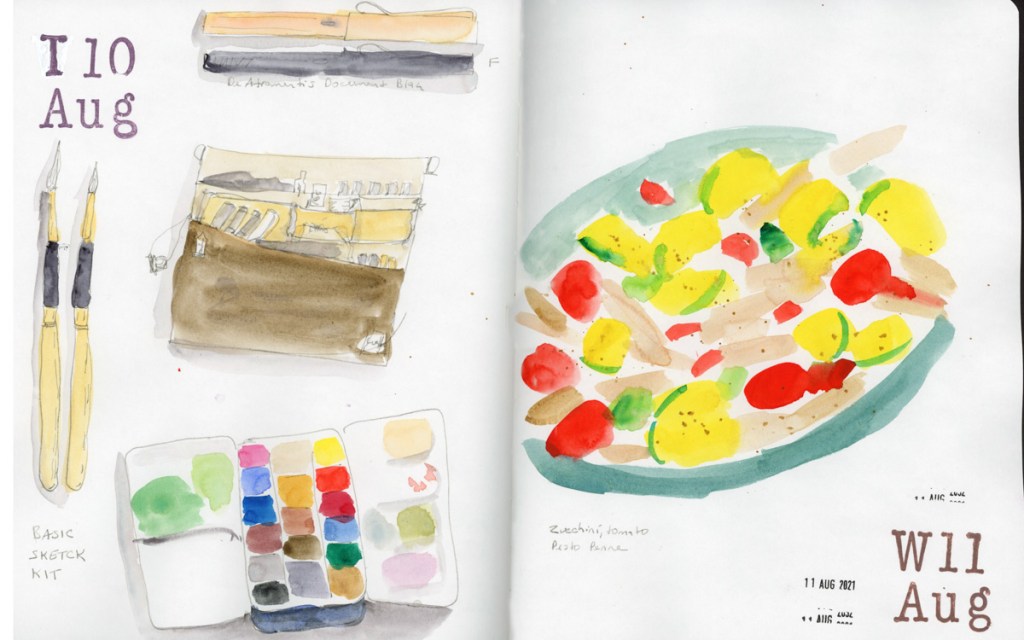 My materials sketch (and a food sketch!) from the August 2021 class.