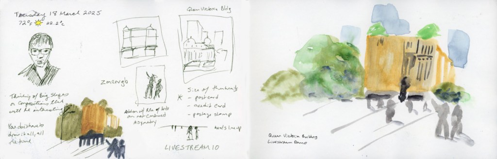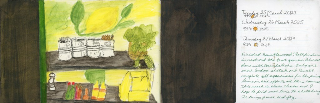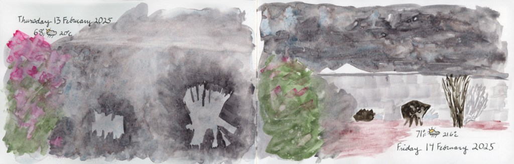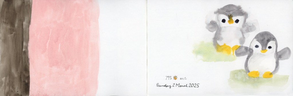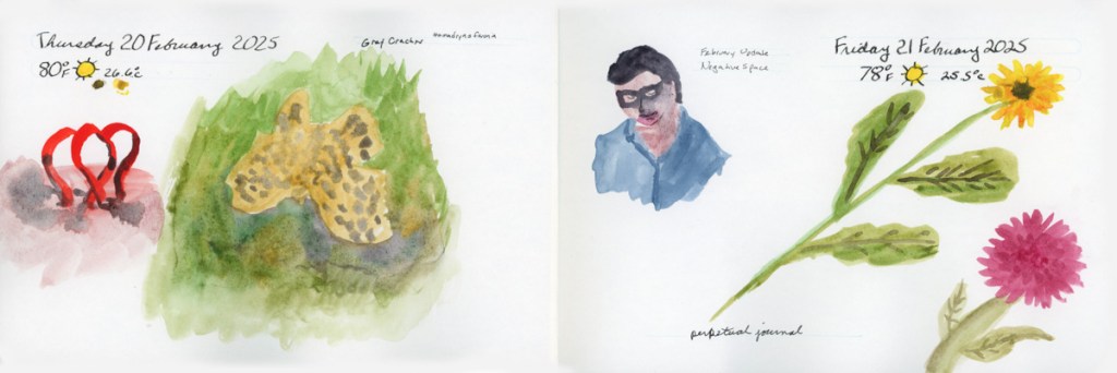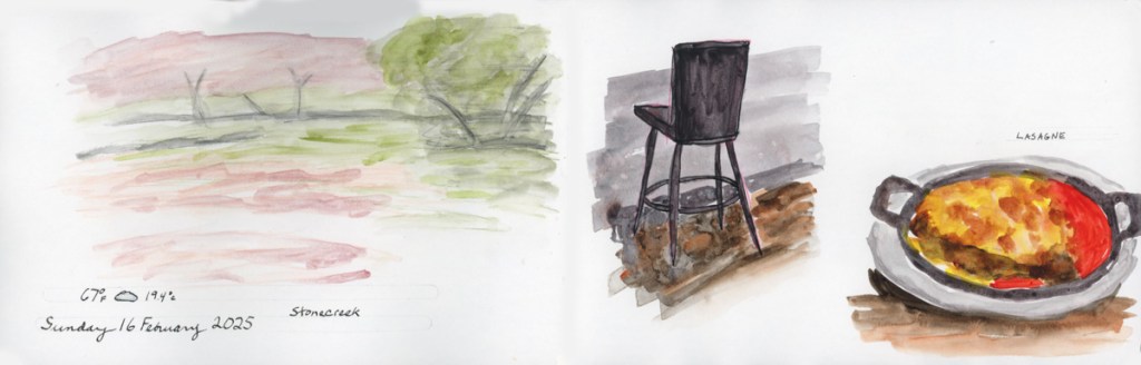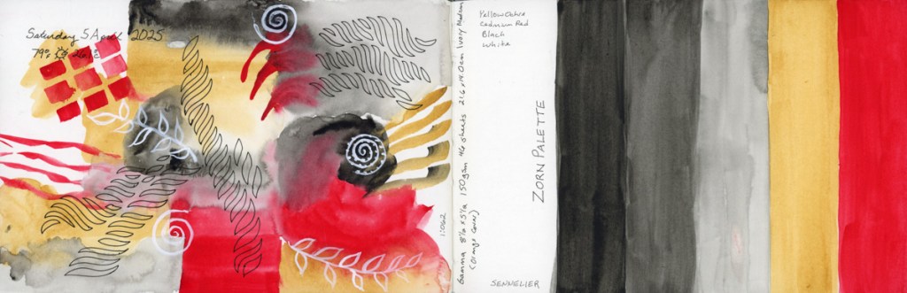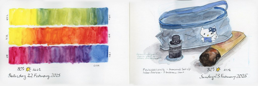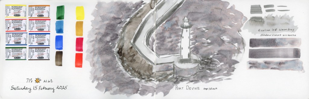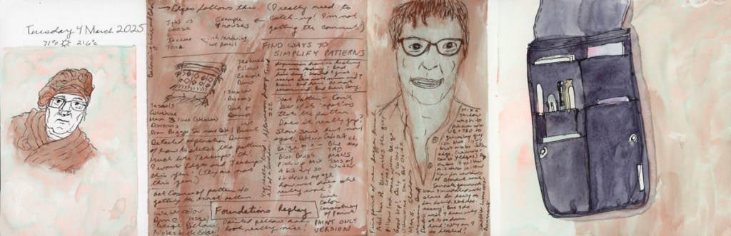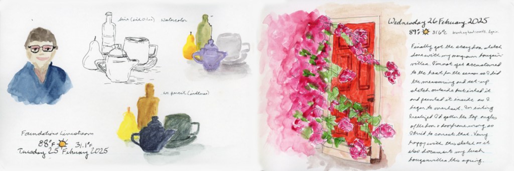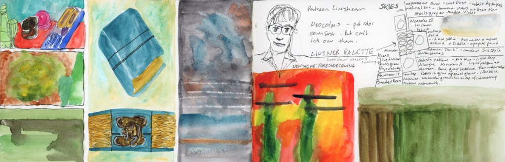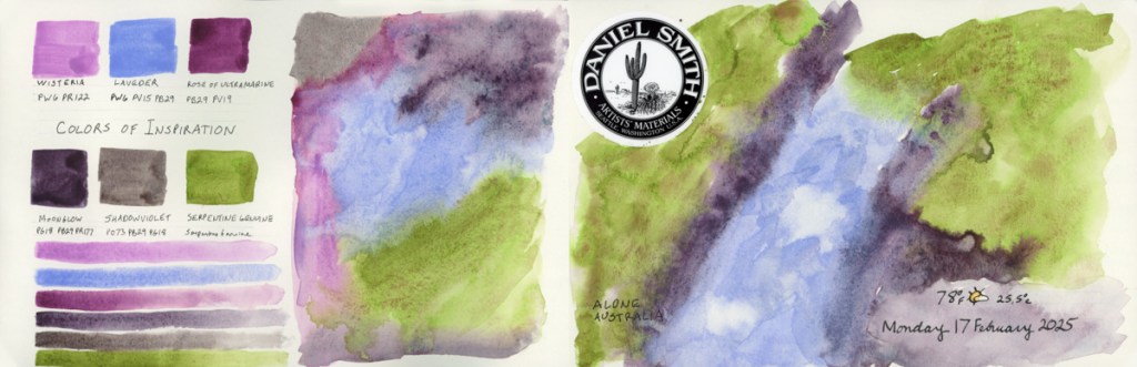 I continue my personal challenge to work through all of Stillman and Birn paper types, using this softcover 8.5 x 5.5 landscape size. Volume 20 will be the Delta series, with heavier weight paper, as I begin the Travel Sketching class. I’m not ready to let go of the Ivory paper, just yet. I’m also looking forward to experimenting with heavier water flow exercises like in the Painting Yourself Calm book by Jean Haines. With fewer pages, 26 sheets, I’ll move through it faster, which hopefully will be good timing for a new sketchbook to coincide with a family vacation I’ll be taking in mid-April.
