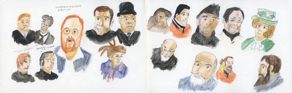 I’ve finished my 19th sketchbook. I have done a lot of color charts in this one, as well as Foundations coursework. I have sketches done from my Stonecreek walks. I have been rather experimental in doing more design with color charts, evolving into a new exploration of abstracts. I did 100 People in One Week in this sketchbook, too.