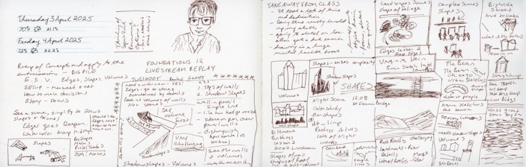 I begin the book with the Liz Steel Patreon community challenge to focus on negative spaces and painting. For the March challenge, I worked to the edge. April is foreshortening, and I end the sketchbook with a foreshortened view of Tuzigoot, which is also a nice finish to Foundations.