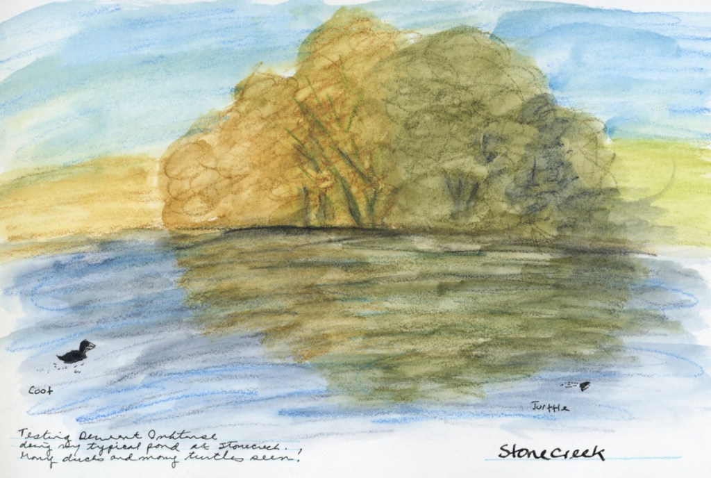 They lay down like watercolor pencils. The lead is a little softer than Albrect Durer, so sharp tips break off. However, sharpening with a knife or using the sticks could fix that. I find it challenging to find which color I’m looking for in my kit bag, when I’m on location, because the pencils barrels are painted black, and the leads don’t always look like the color they put down. (I’m looking at you Amber and Tan whose leads look green, but they lay down as muted yellows.) The color indicator on the end could help, but I am reluctant to store my pencils tip down, especially with a soft lead. Maybe a roll-up pencil case is the solution?