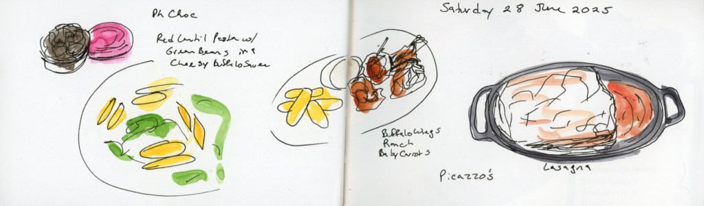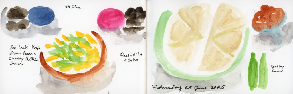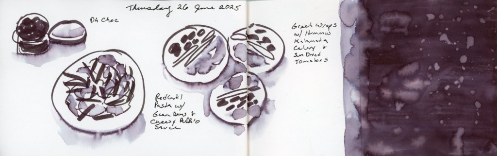 These hot summer days are slowing me down significantly! I’m continuing with the food sketches, but not much else. Likely because I’m not really leaving the house for anything but grocery shopping, and I keep forgetting to bring my sketchbook for that. But watching shows gives a good opportunity to try some quick portraits.