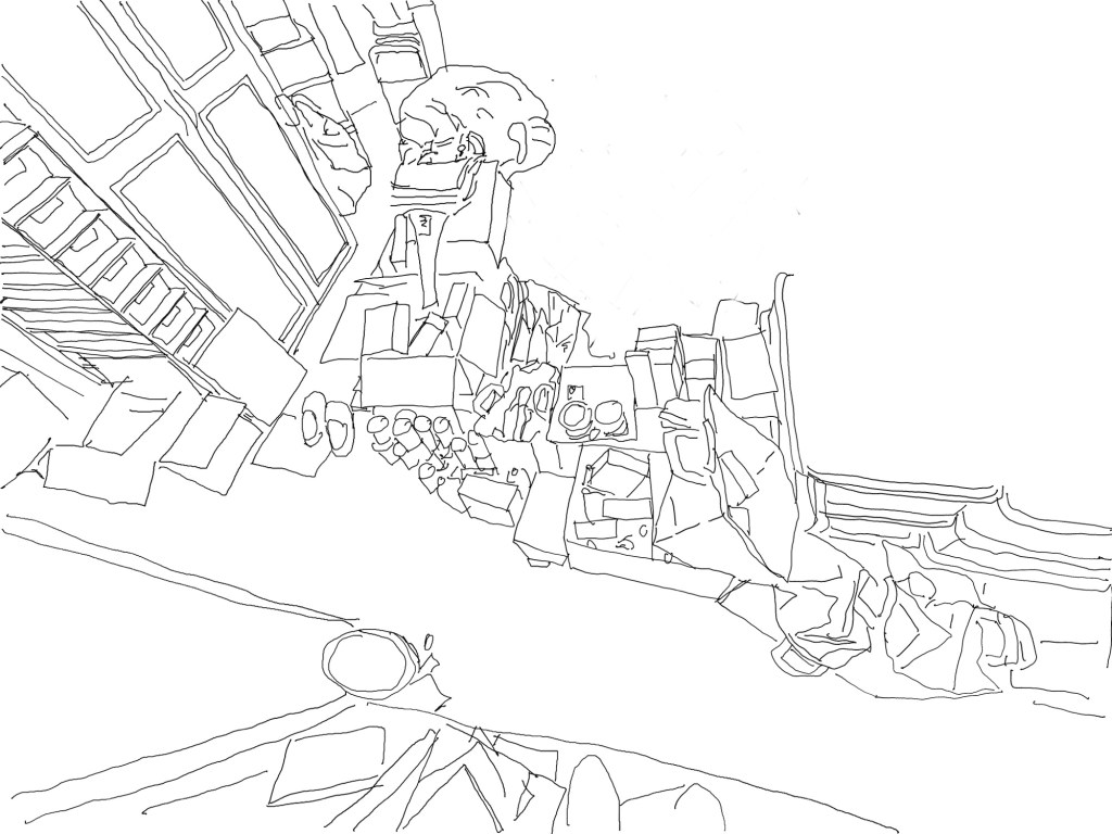 The next clutter sketch I attempted I also used inspiration from Paul Heston, who does these amazing room sketches, always including his own hands drawing. I used my iPad. I felt like I was cheating, but I really wanted to make clutter sketches, and felt my drawing skills were simply not up to the number of lines required, the proportions, any of it. So I put the photo into Procreate and drew the lines, basically tracing the photograph. This is what I ended up with. I loved it. Just the lines, simplifying the scene into basic black and white. I still use this approach today.