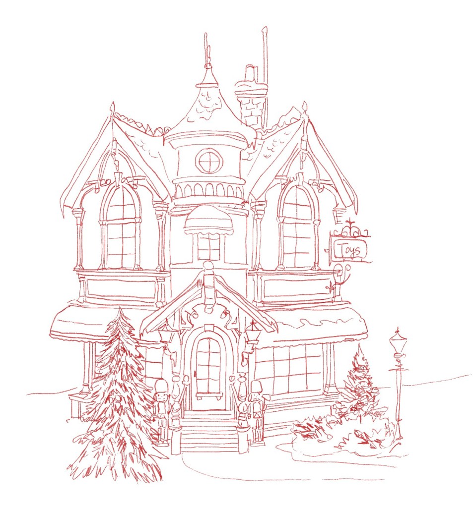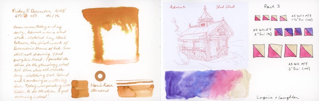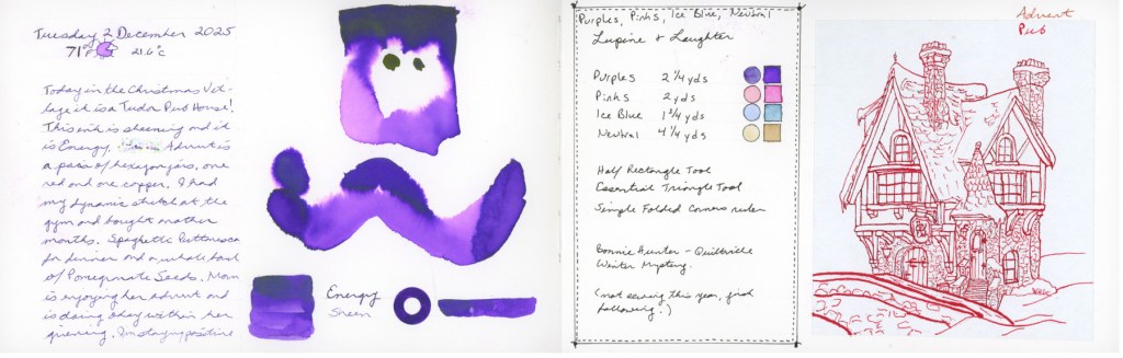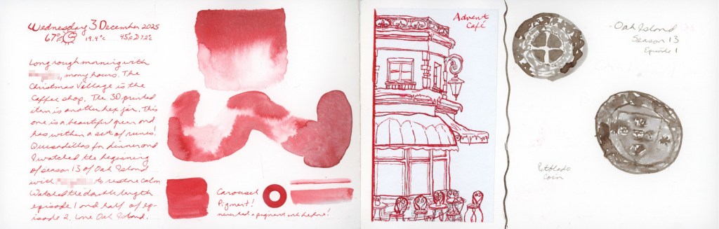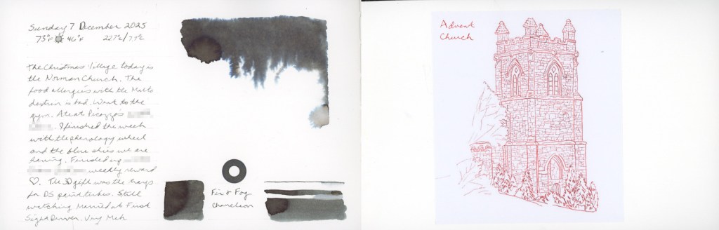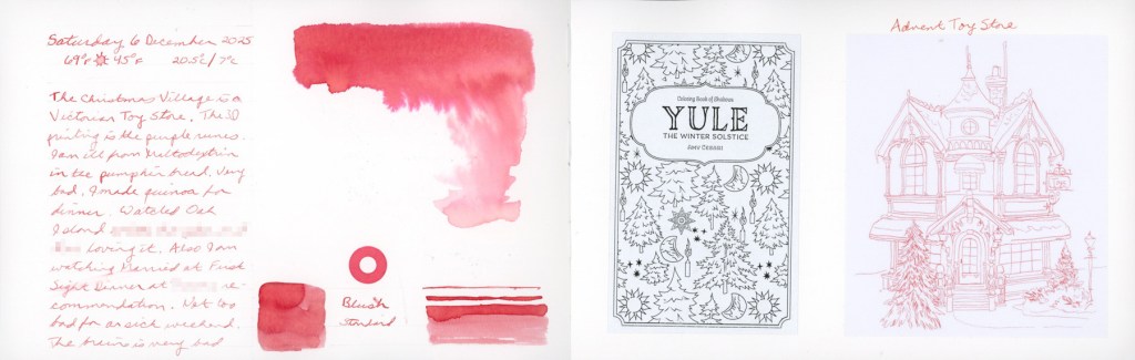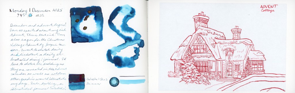 Every year I love Diamine Inkvent and this year is no different. Each day gets the ink swatch. I wanted to sketch each building in the Jacquie Lawson Christmas Village this year, but insecurity got the better of me. I did trace the first week of buildings, however. In red, as the Liz Steel Patreon theme this month is Red.