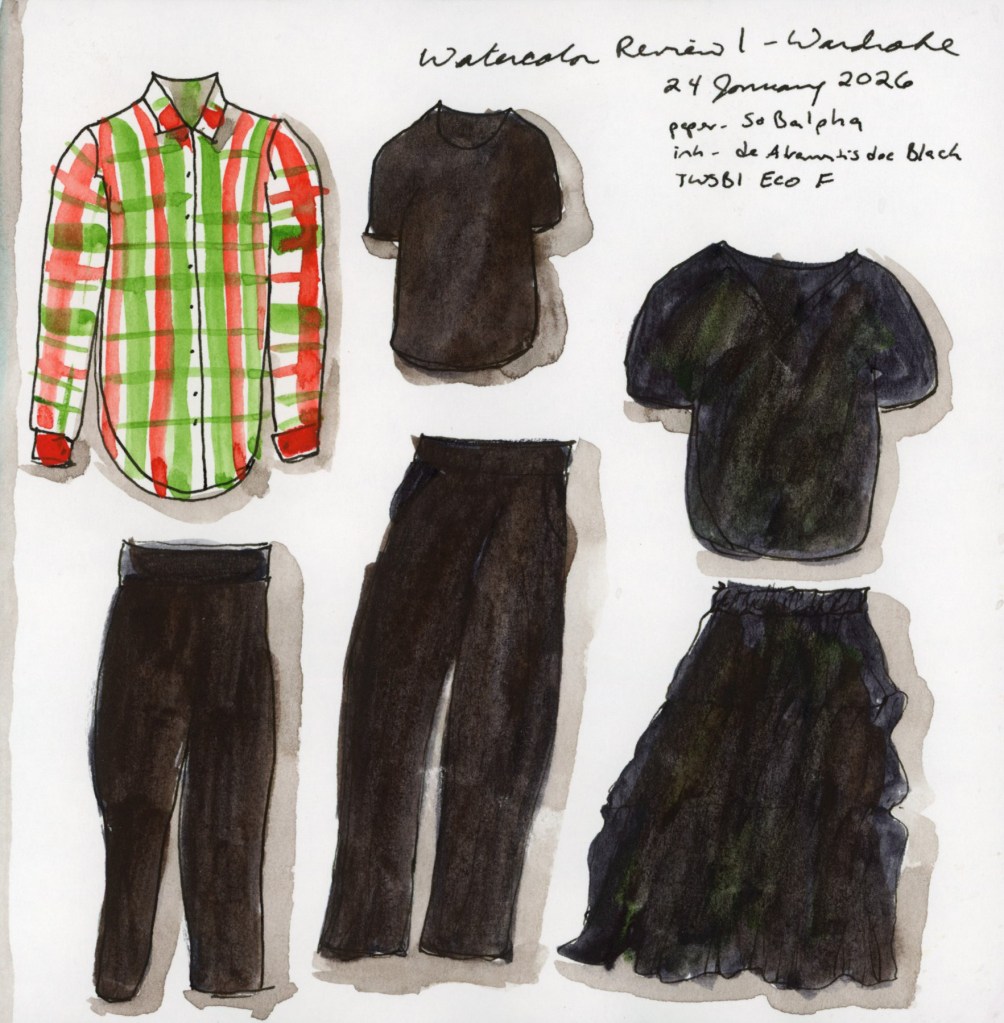 For the watercolor course, I did one of my favorite exercises, the wardrobe. My wardrobe is mostly black, but for this winter I did add this festive plaid shirt that was so fun to paint!