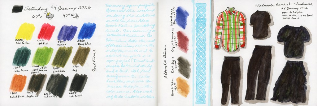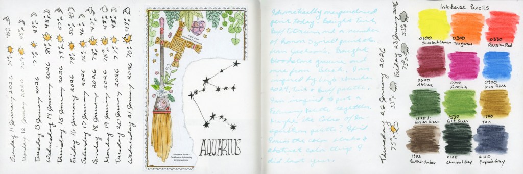 January is moving by so fast! I did work on Alex Boon’s Inktense course in his Nature Journaling Circle. He offers a recommended set of 12, and an optional 12 he recommends to make it 24 set.