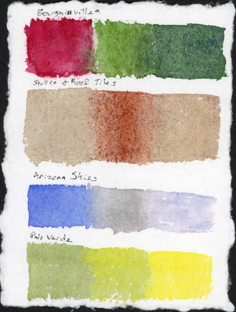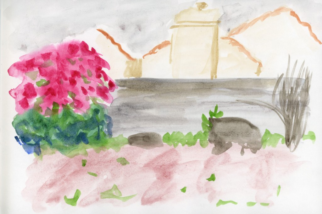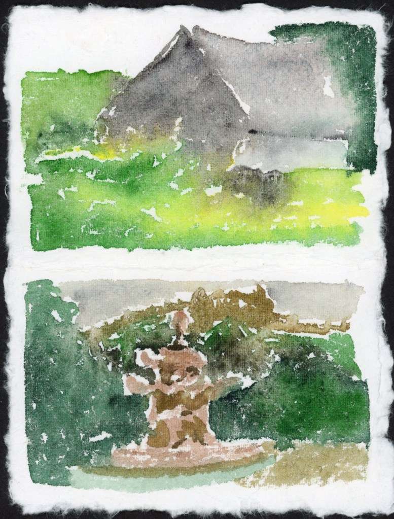 My biggest takeaway this time through was the effect of paper on how watercolor performs. I think if I use that handmade paper my sketches will need some lines to bring out the subjects, but for class, I enjoyed experimenting with direct watercolor, no lines.