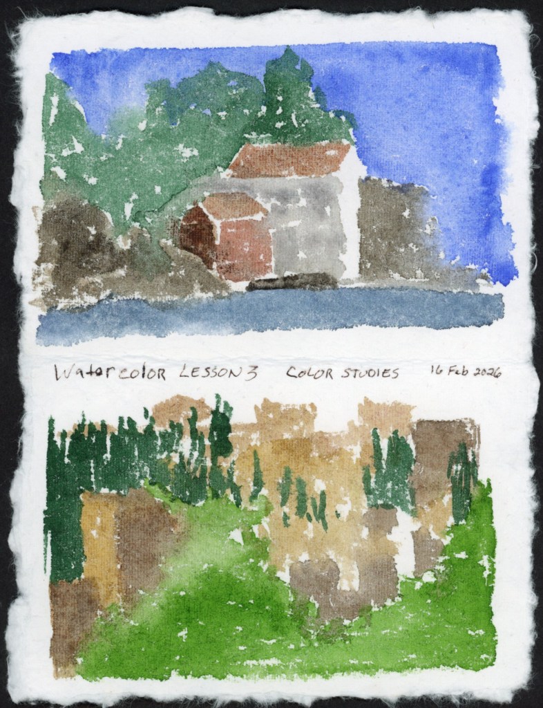 Here are all the exercises I did this year for it. I used a handmade paper for some of the assignments that was so very different to work with. Colors are luminous on it, and it is highly absorbent. It takes forever to dry, and so colors really merge and blend. Detail is lost and I was too impatient to go back and try to add more details after it had dried, so my work has a very soft, and blended look. It has taught me a lot about the paper, and how much of impact paper really does have on watercolor. With each new practice I’m getting better and better at it.